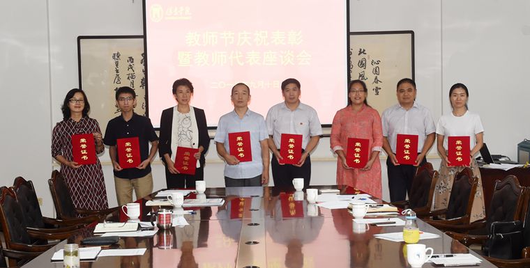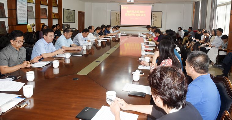 9月10日下午,我校在行政楼二楼会议室召开2018年教师节庆祝表彰暨教师代表座谈会。校领导王军、胡连利、宋书通、刘清波、曹荣、回顺利、高颖、徐景星与教师代表欢聚一堂,喜迎第34个教师节的到来。