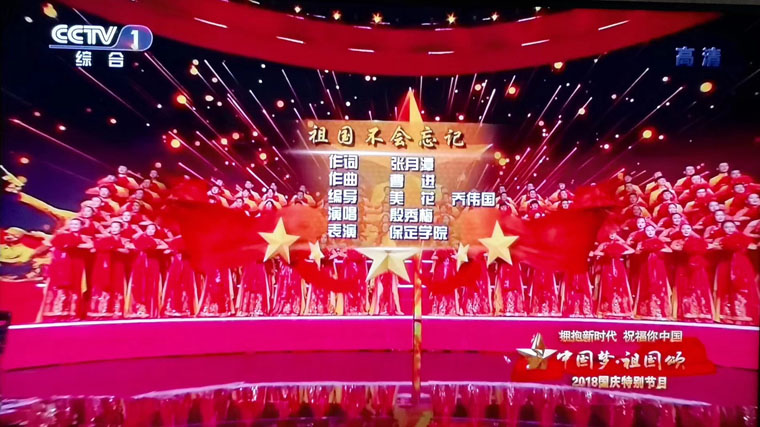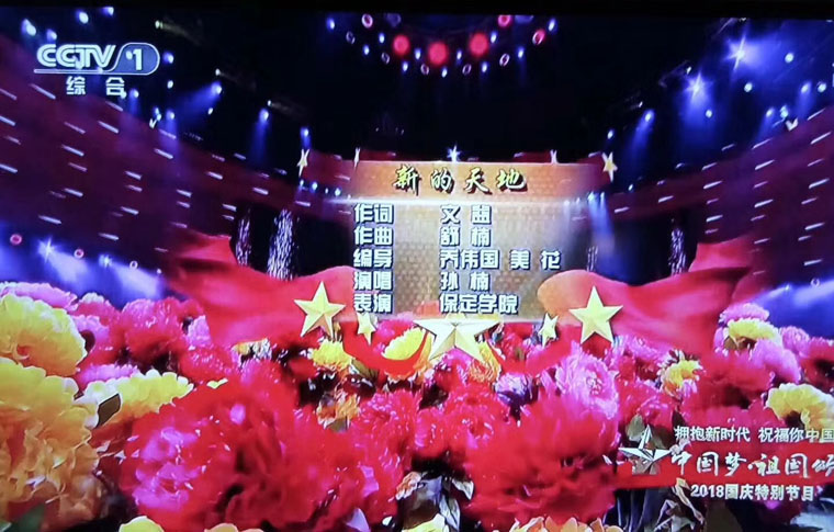 101日晚,中央广播电视总台举办的《拥抱新时代 祝福你中国——“中国梦·祖国颂”2018国庆特别节目”》在中央电视台综合频道和综艺频道播出,我校音乐舞蹈学院200余名学生受邀参加现场演出。他们在《祖国,我们为你放歌》《新的天地》《祖国不会忘记》《赞赞新时代》《我们的新时代》等5个节目中精彩出演,用青春的歌舞展现了保定学院人的风采,表达出对伟大祖国的祝福之情。