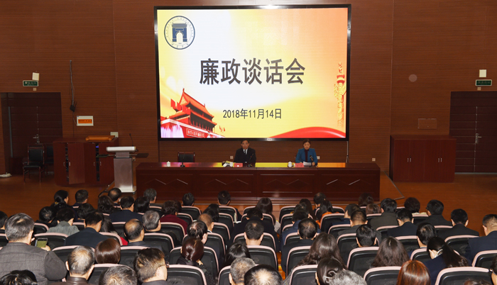 11月14日上午,我校在昌绪学术厅召开中层及以上干部集体廉政谈话会。校领导王军、胡连利、宋书通、刘清波、张德义、曹荣、回顺利、高颖、徐景星出席会议,全体中层干部参加会议。