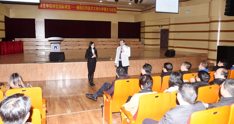 在为期两天的培训中,海博博士重点阐释了德国和欧洲的职业教育人才培养体系,德国的应用技术大学校企合作人才培养模式、应用技术大学教师组成、应用技术大学课程体系、工业4.0对人才培养的新要求等方面的内容。海博博士所介绍的德国应用技术大学办学模式与经验,为我院的转型发展提供了宝贵借鉴。