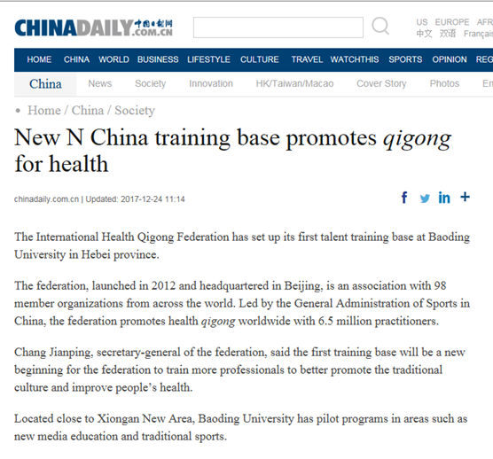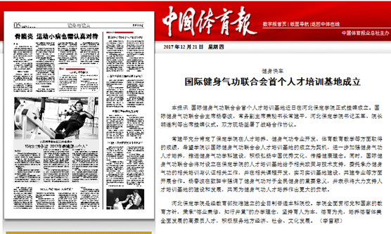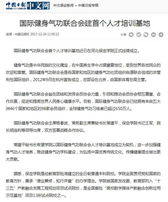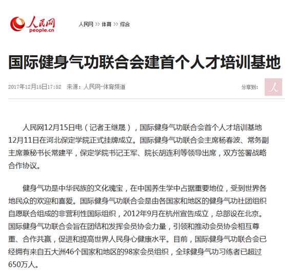 201712月中旬,我院正式成为首个国际健身气功联合会人才培训基地后,引起了社会的广泛关注和强烈反响。国家体育总局官网、国际健身气功联合会官网和中国健身气功联合会官网都在第一时间发布了相关消息,人民网、《中国体育报》和《中国日报》等国家级媒体也相继在重要版面刊登了这一新闻。