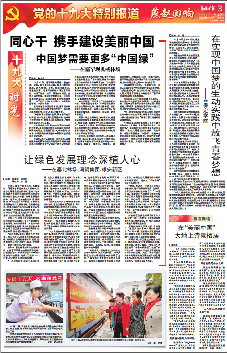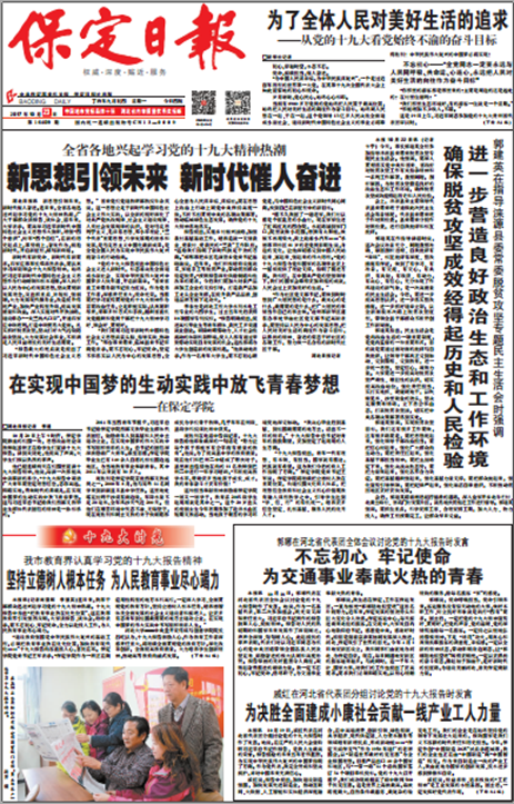 1022,河北日报在重要版面以《在实现中国梦的生动实践中放飞青春梦想——在保定学院》为题,详细报道了我院师生深入学习十九大报告的有关情况。1023的保定日报在头版对此新闻进行了全文转载。
