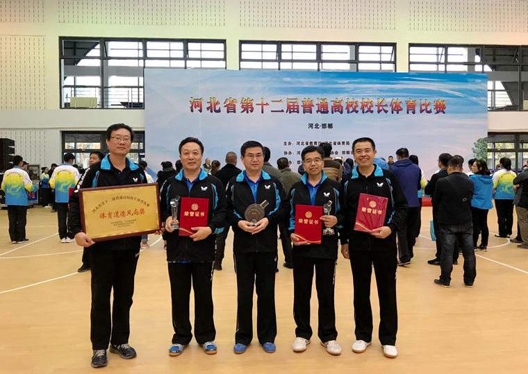 11月2日-4日,由河北省教育厅、河北省体育局主办,河北省大学生体育协会、邯郸市体育局协办,邯郸职业技术学院承办的河北省第十二届普通高校校长体育比赛在邯郸职业技术学院举行,共有来自河北省教育厅、河北省体育局和全省高校的30个代表队参赛。由吴二斌任领队,王宏建任教练,张德义、回顺利、徐景星三位院领导为队员的我院代表队,在乒乓球比赛中不畏强手、团结拼搏,喜获团体第三名的历史最好成绩,并荣获体育道德风尚奖。在个人项目上,徐景星获得男子单打第5名,张德义获得男子单打第7名。张德义荣获体育道德风尚奖“优秀运动员”称号,王宏建荣获体育道德风尚奖“优秀教练员”称号。