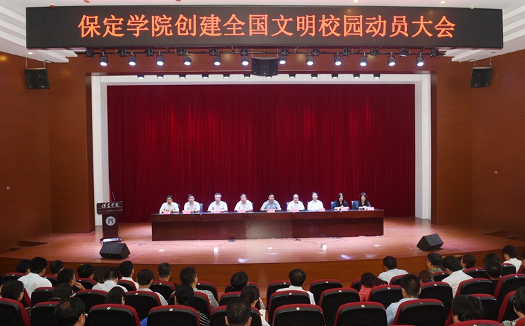 5月31日下午,保定学院创建全国文明校园动员大会在多功能厅隆重举行。院领导王军、胡连利、宋书通、刘清波、张德义、曹荣、回顺利、高颖、徐景星,全体中层干部、教师和学生代表共600余人参加大会。会议由院长胡连利主持。
