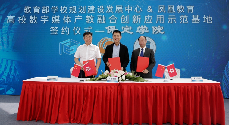 5月12日,由教育部学校规划建设发展中心、凤凰卫视集团·凤凰教育联合启动的“高校数字媒体产教融合创新应用示范基地”项目签约仪式在北京凤凰国际传媒中心举行。我院院长胡连利、副院长刘清波受邀出席仪式,胡连利代表我院与教育部学校规划建设发展中心、凤凰教育签订了三方合作协议。