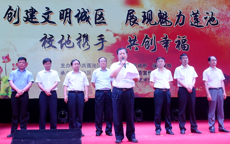 院党委副书记宋书通出席开幕式并致辞。他首先对“保定市莲池区创建省级文明城区暨第二届文化艺术节”的开幕表示热烈祝贺,并简要介绍了我院的悠久历史和近年来的转型发展。他表示,保定学院将一如既往地与莲池区紧密携手,加强校政、校地协调联动,继续推进传统文化教育、社会志愿服务、大学生创新创业等方面的深度合作,共创文明莲池、幸福莲池、魅力莲池。