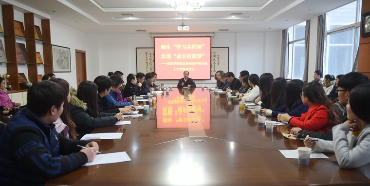 12月7日,我院在行政楼二楼会议室召开“师生学习共同体 实现成长校园梦”主题座谈会。院长胡连利,教务处、发展规划与质量监控中心、宣传部、团委负责同志,政法系师生代表参加座谈会。会上,政法系主任纪常造介绍了今年政法系知识产权专业学生参加国家司法考试取得的优异成绩,与会师生交流了教学和学习体会,对知识产权专业提出了许多人才培养方面的意见和建议。胡连利对政法系在专业建设上付出的努力和取得的成绩给予充分肯定,并希望知识产权专业师生要更多地参与司法实践,教学与案例紧密结合;全院师生要在教学中形成学习共同体,使校园真正成为学生成长成才的乐园,成为学生实现梦想的加油站;一定要通过全院师生的共同努力,把学院办出一种氛围,在这种氛围里,人人刻苦钻研奋发有为,人人百折不挠追寻梦想。
