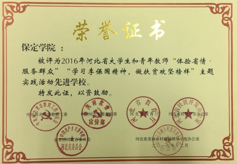 近日,中共河北省委教育工委、中共河北省委宣传部、河北省教育厅等六部门联合下发文件,对2016年河北省大学生和青年教师“体验省情·服务群众”“学习李保国精神,做扶贫攻坚榜样”主题实践活动先进集体、个人、成果进行了表彰。我院获得“先进学校”荣誉称号,“古风遗韵”实践小分队、“花开远方”支教小分队被评为“先进小分队”,葛旭升、高立威、张帆等7名教师被评为“优秀指导教师”,高云鹏、韩玉杰、武萌萌等13名学生被评为优秀实践队员,《关于河北省古村落保护与发展现状的调查》《白洋淀水污染调查与解决建议以刘李庄镇为例》《保定市红色文化教育在小学开展现状的调查研究》等6项调研报告被评为“优秀调研报告”。