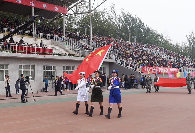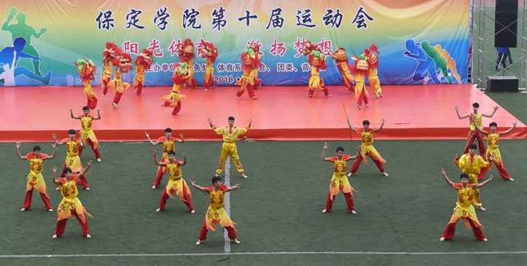 在一场既隆重又别开生面的开幕式上,裁判员、运动员方队精神抖擞步伐整齐地进入体育场,鲜艳的五星红旗在全场观众齐唱的国歌声中冉冉升起,随后,伴着青春昂扬的原创会歌《追梦的脚步》,升起了保定学院院旗和为本届运动设计的会旗。接下来,精彩的视听盛宴拉开帷幕:四位教师演唱的《手拉手》,传递着和平、团结、协作的奥运精神;教工华尔兹表演,是另一种方式的师者之美;学生的狮魂舞、跆拳道和炫鼓表演无不展现着青春、力量和阳光;歌曲《红旗飘飘》使开幕式达到高潮,也让在场的每位观众热血沸腾。随着观众们的欢呼,礼花和千余只和平鸽飞向空中,完美地诠释了本届运动会“阳光体育 激扬梦想”的主题。
