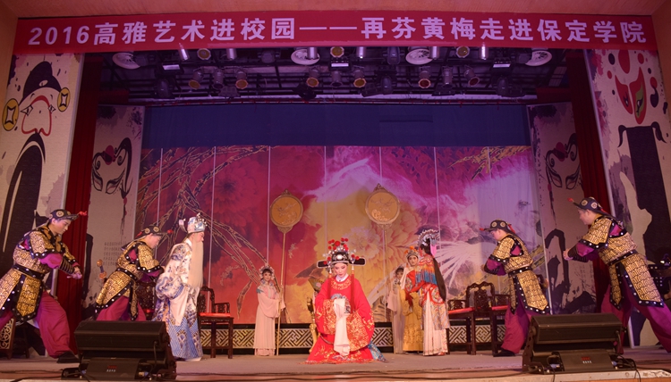 11月11日晚,2016高雅艺术进校园——安徽再芬黄梅艺术剧院走进我院专场演出在图书馆多功能厅举行。艺术家们带来了经典剧目《女驸马》,为师生们献上了一场精彩纷呈的黄梅盛宴。河北省教育厅思政体卫处调研员崔玉伟,国家一级演员、再芬黄梅艺术剧院副院长马自俊,我院党委书记王军、院长胡连利、党委副书记宋书通、副院长高颖和700余名师生一起观看了演出。