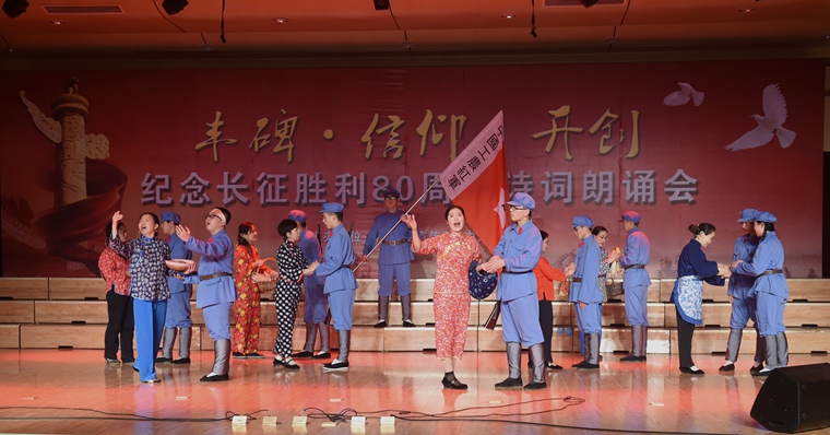 朗诵会在中文系全体教师铿锵有力的大合唱《红军不怕远征难》中拉开序幕。之后,《十送红军》《奔跑》《特殊的战斗》《半条棉被》《我和她曾经十三岁》《过雪山草地》《长征路漫漫》……中文系师生以经典诗词和原创作品为载体,伴以情景表演、舞蹈、演唱等形式,用深情地诵读展现了我院师生继承发扬长征精神的昂扬斗志和坚定决心。师生们精彩的演绎,赢得了观众们阵阵热烈的掌声。