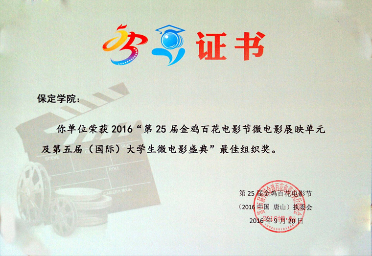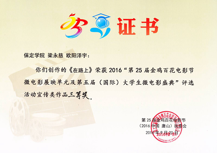 920,第25届金鸡百花电影节微电影展映单元暨第五届(国际)大学生微电影盛典在北京隆重举行。我院信息技术系教师梁永慈、学生欧阳泽宇等人的作品《在路上》荣获广告宣传类作品三等奖,我院被评为最佳组织单位。
