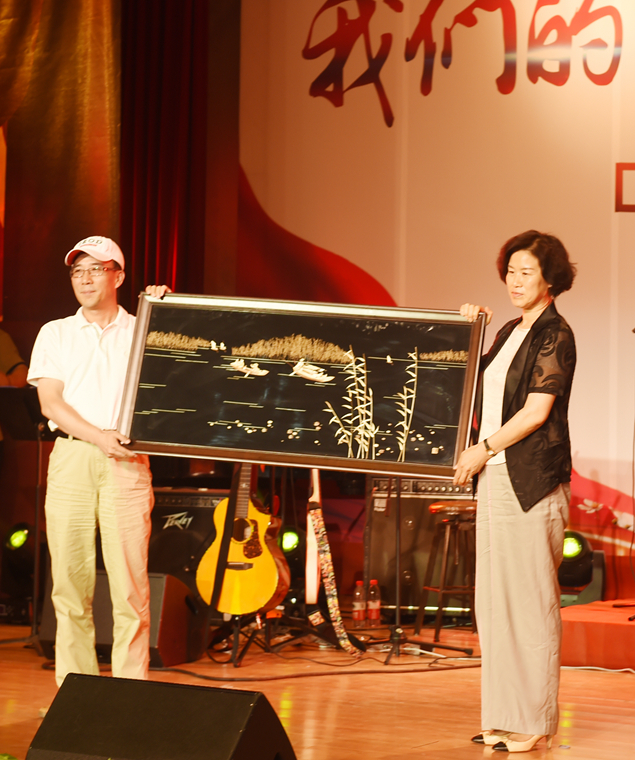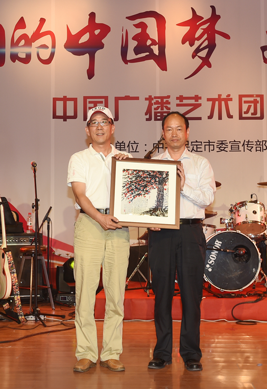 保定市政府副市长闫立英、保定市文广新局局长赵其国分别向中国广播艺术团赠送了礼物。