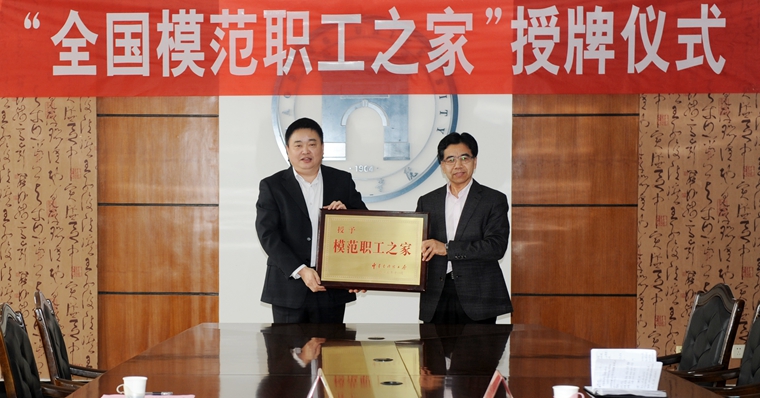 伴随着与会同志的热烈掌声,黄家荣将“全国模范职工之家”荣誉牌匾交到了徐景星手中。