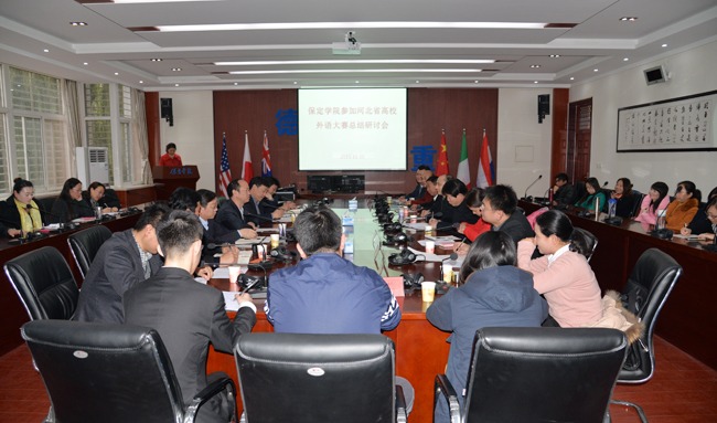 11月10日下午,我院参加河北省高校外语大赛总结研讨会在外语楼同传实验室举行。院长胡连利出席研讨会。教务处、发展规划与质量监控中心、团委、外语系、政法系负责同志,外语系各教研室主任、获奖师生代表共60余人参加研讨会。