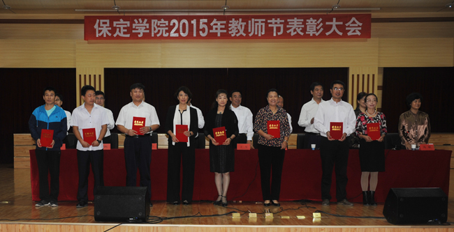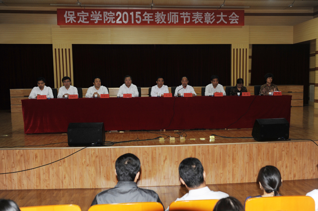 9月10日上午,保定学院2015年教师节表彰大会在音乐厅隆重召开。院领导王军、胡连利、宋书通、刘清波、张德义、曹荣、回顺利、高颖、徐景星出席大会。各系部、部门主要负责人,获得各项荣誉称号的优秀教师及学生代表共270余人参加大会。大会由副院长高颖主持。