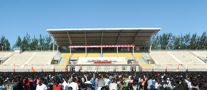 9月12日上午8:00,在雄壮的国歌声中,保定学院2015级新生开学典礼暨军训动员大会在体育场隆重举行。院领导王军、胡连利、宋书通、刘清波、张德义、曹荣、回顺利、高颖、徐景星,各系和相关部门负责人、辅导员,承训学生教官及来自全国22个省区的4849名新生参加了大会。大会由院党委副书记宋书通主持。