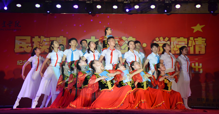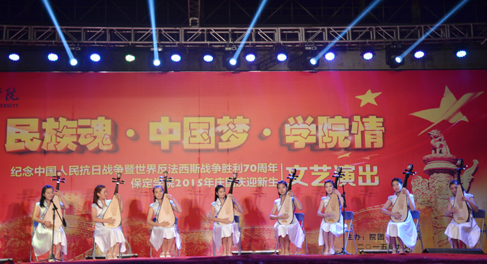 923日晚,为纪念中国人民抗日战争暨世界反法西斯战争胜利70周年,庆祝新中国成立66周年,展现大学生的时代风采,保定学院“民族魂·中国梦·学院情”2015年庆国庆迎新生文艺演出在体育场隆重举行。团市委书记杨跃峰,莲池区团委副书记苏欢,我院党委副书记宋书通,各系、相关部门负责同志和4000余名新生一同观看了演出。
