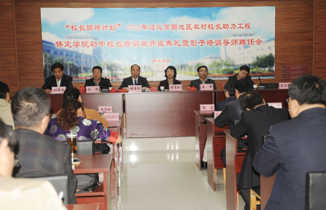 10月10日上午,校长国培计划—2015年边远贫困地区农村校长助力工程初中校长培训班开班典礼暨影子培训导师聘任会在我院隆重举行。教育部教师工作司综合处调研员黄贵珍、河北省教育厅人事处张恩永、保定市教育局副局长刘恒,我院党委书记王军、院长胡连利出席典礼,保定市8所影子培训基地校长、我院继续教育部负责同志和50名参训学员参加典礼。典礼由副院长刘清波主持。
