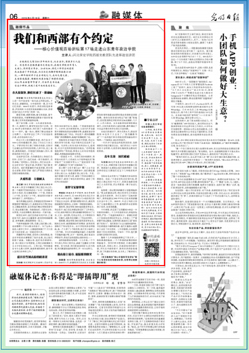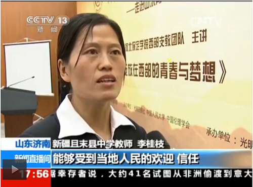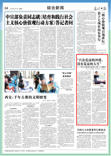 417日中央电视台《新闻直播间》、《光明日报》417日和418日重要版面,分别报道了我院西部支教毕业生群体先进事迹宣讲团赴山东青年政治学院,受邀参加由中宣部指导,光明日报社、中国人民大学、中国伦理学会共同主办的“核心价值观百场讲坛”,以《安放在西部的青春与梦想》为题进行宣讲的消息,引起强烈的社会反响。