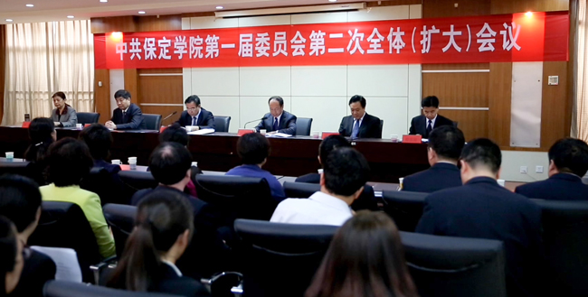 4月30日上午8:30,中共保定学院第一届委员会第二次全体(扩大)会议在行政楼教工之家召开。院党委书记王军代表常委会向全会作了题为《解放思想 拥抱变革 为把我院建设成为具有鲜明特色的高水平应用型地方本科院校而努力奋斗》的工作报告,会议由院长胡连利主持。院党委常委刘清波、张德义、曹荣、徐景星在主席台就坐。学院党委委员出席会议,院纪委委员,不是“两委”委员的中层干部、民主党派负责人列席了会议。