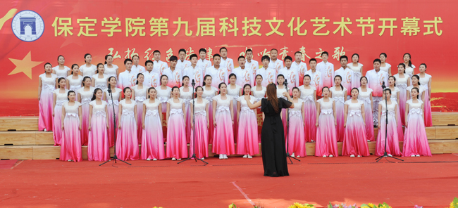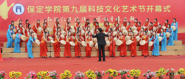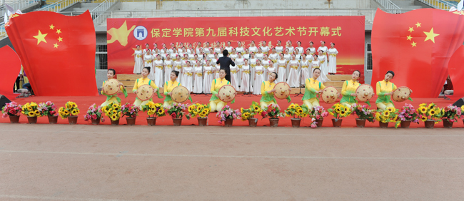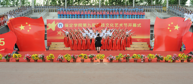 5月13日下午,我院第九届科技文化艺术节开幕式暨“弘扬红色旋律,唱响青春之歌”纪念抗日战争胜利70周年主题歌会在体育场隆重举行。院领导王军、胡连利、张德义、回顺利、高颖、徐景星,团市委副书记刘丹,驻保高校团委书记和3000余名学生参加了开幕式。