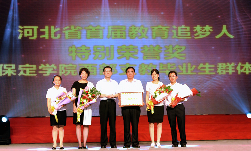 9月10日晚,由河北省教育厅、河北省新闻出版广电局主办,河北人民广播电台独家承办的“追梦无限 乐在行动”——河北省首届“教育追梦人”评选颁奖暨教师节主题晚会在石家庄隆重举行。我院西部支教毕业生群体荣获特别荣誉奖,副省长许宁亲自为我院党委书记王军颁发了奖牌,并与一同上台领奖的我院党委宣传部部长马丽娟,西部支教毕业生群体代表新疆且末县中学教师李桂枝、井慧芳,西藏拉萨广西友谊小学教师刘建合影留念。