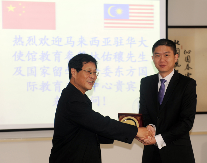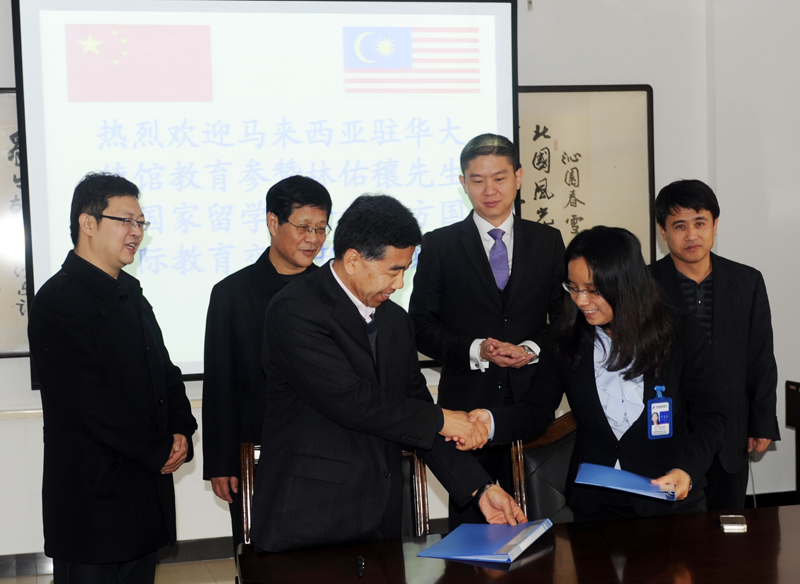 11月7日上午,马来西亚驻华大使馆教育参赞林佑穰、国家留学基金委东方国际教育交流中心马来西亚部北方大区主任卢永立一行三人来我院访问。院长崔勇、党委常委徐景星及国际教育交流中心负责人会见了来宾。崔勇院长介绍了我院概况和近年来国际合作项目的开展情况。林佑穰参赞就马来西亚国情、高等教育状况及留学政策作了说明。卢永立主任介绍了东方国际正在开展的留学项目。党委常委徐景星代表我院与东方国际教育交流中心签订了合作框架协议并陪同来宾参观了学院校史馆。随后,在“马来西亚驻华大使馆选派中国留学生政府补贴项目”说明会上,林佑穰一行向我院300余名应届本科毕业生介绍了赴马留学的途径、优惠政策及当地的生活环境和社会状况。
