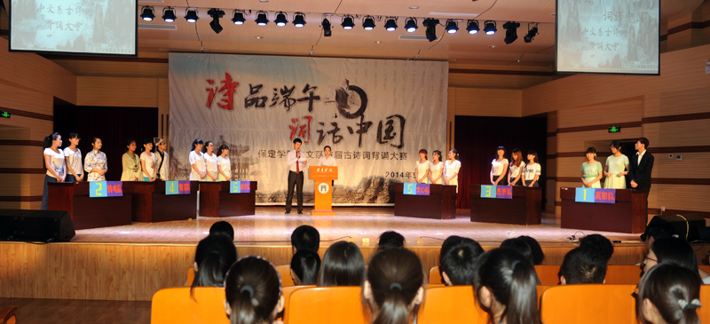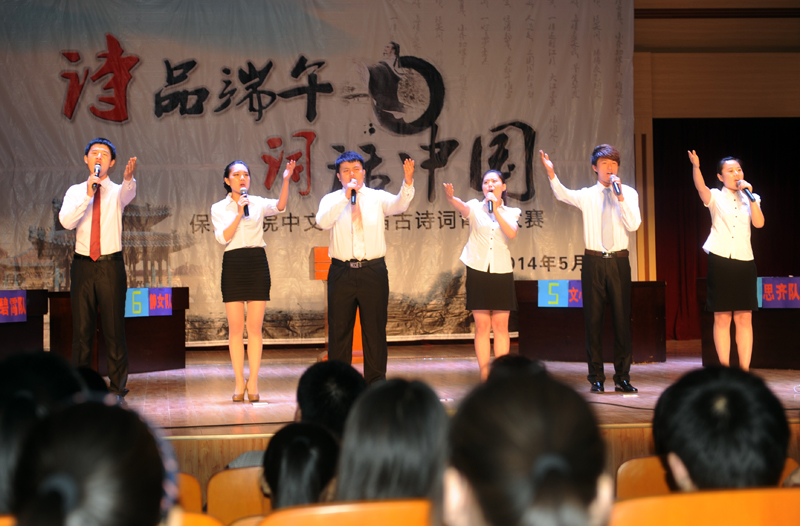 5月29日晚,我院中文系在音乐厅举办了“诗品端午·词话中国”古诗词背诵大赛。比赛旨在纪念我国古代伟大的爱国诗人屈原,弘扬中华博大精深的诗词文化,提升学生的专业素养,建设学院优良学风。副院长张德义、高颖,有关部门负责同志观看了比赛。张德义副院长还为比赛即兴作诗并朗诵,赢得了师生热烈的掌声和喝彩。本次比赛内容丰富,题目设置有的与习近平总书记历次讲话引用的古诗词有关,有的与我院西部支教优秀群体工作的地区有关,有的涉及河北籍、保定籍古代作家的诗词作品。比赛灵活多样,有选手必答、限时快答、听歌曲看图片抢答等多种形式。比赛现场气氛热烈,师生热情高涨。