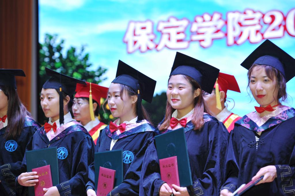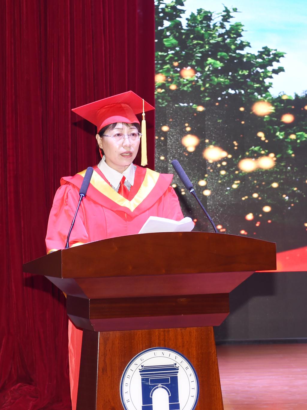校长韩会玲在典礼上作了题为《千川江海阔 风好正扬帆》的讲话。她与毕业生们共同回顾了近年来学校在人才培养、产教融合等方面取得的优异成绩。她说,四年前,朝气蓬勃的你们走进保定学院这座百年学府;四年来,校园里留下了你们勤学善思的青春足迹,记录了你们拼搏奋斗的青春风采。你们全心参与、奋力抒写了母校光辉奋进的四年,镌刻在母校史册上的每一位毕业生的名字和每一段闪亮的事迹,都将被郑重珍藏。韩会玲以四个“勿忘”为毕业生们行前赠言:希望同学们无论走到何方,勿忘爱国初心;无论从事何业,勿忘敬业奉献;无论身处何境,勿忘诚信为本;无论肩负何职,勿忘友善谦和。希望大家心怀理想,脚踏实地,勇于进取,与新时代同行共进,绽放无悔青春。