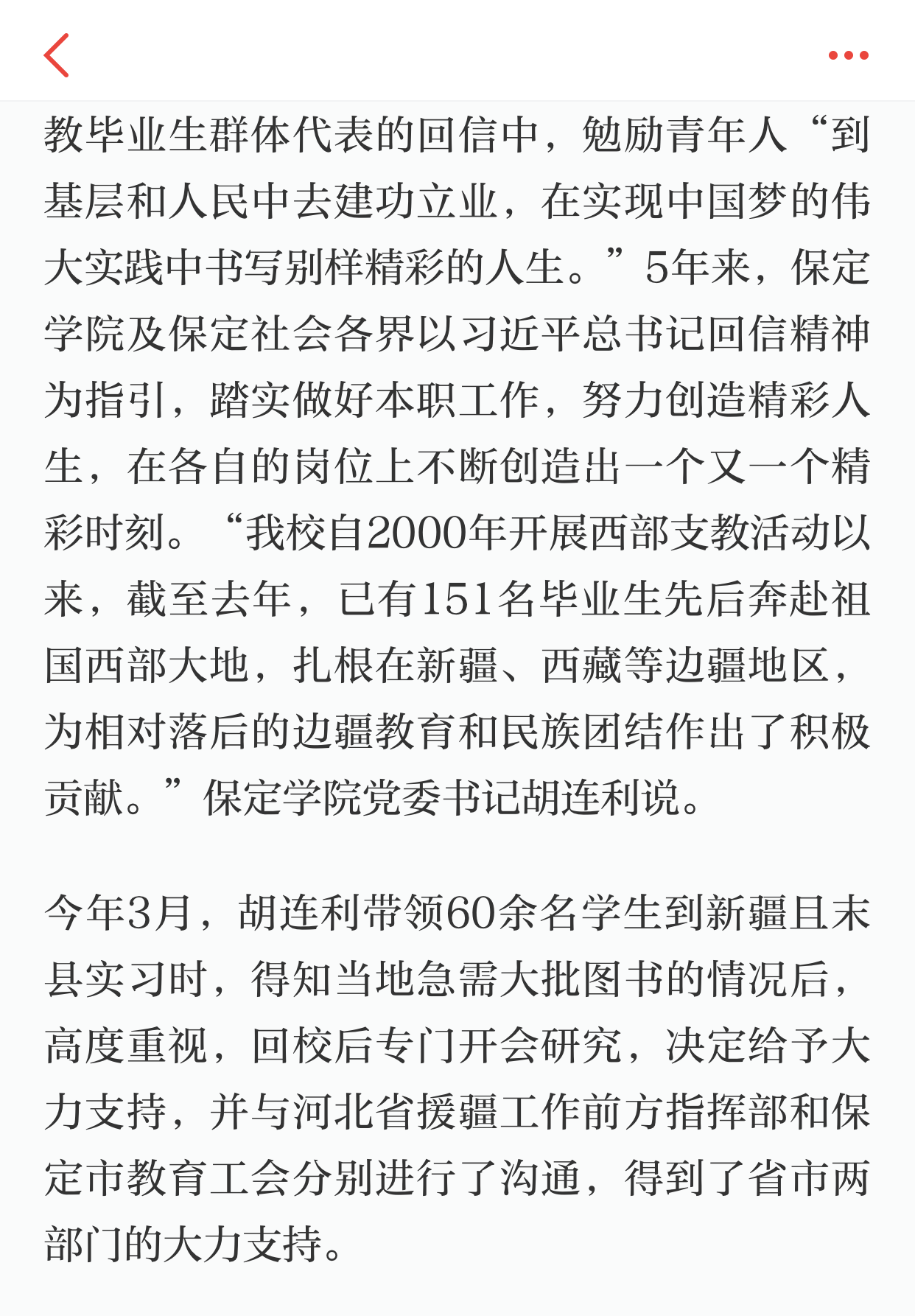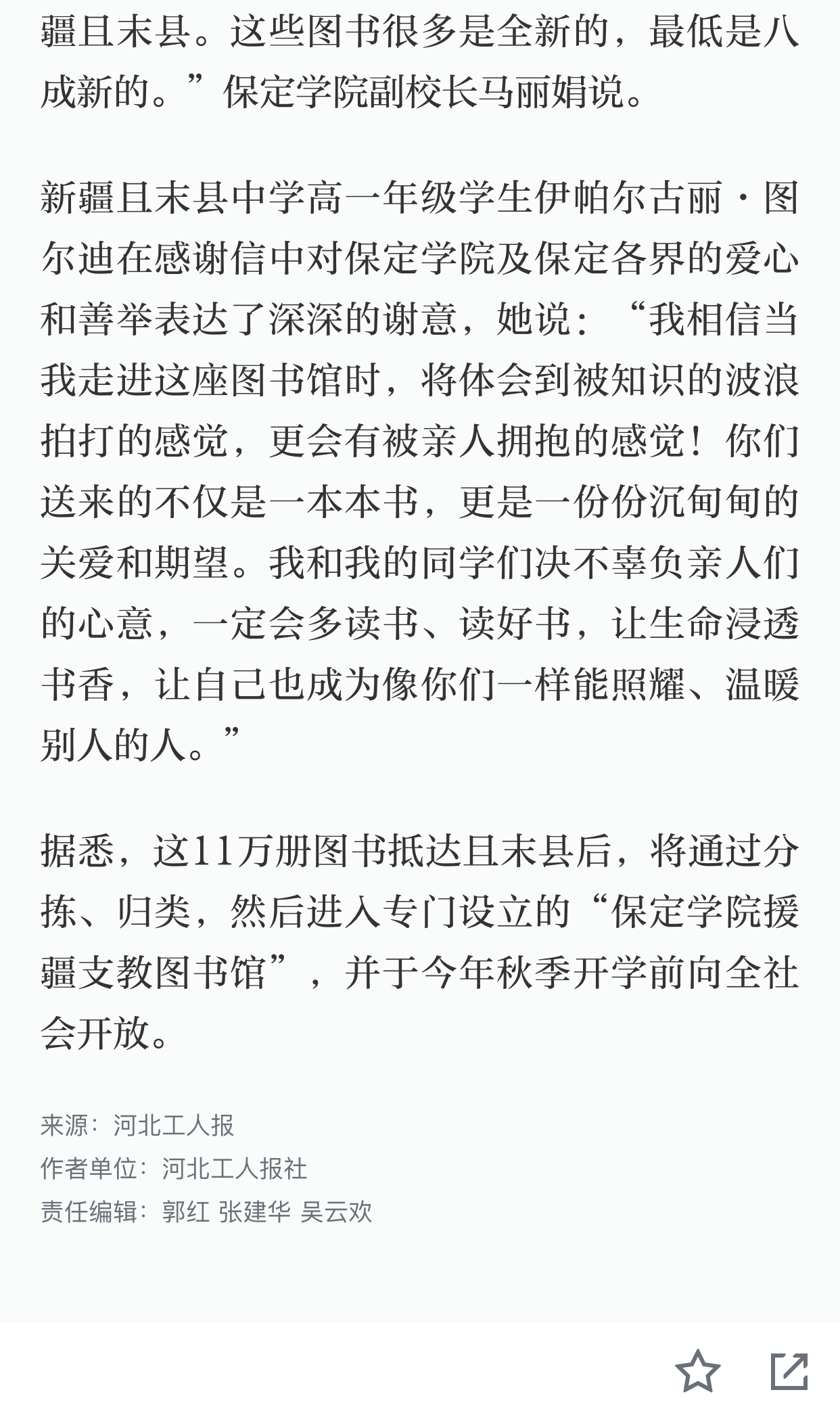6月21日,“学习强国”平台发布“保定学院:11万册爱心图书助力边疆教育”的报道。报道详细介绍了我校践行习近平总书记回信精神,拓展西部支教新途径的创新工作。报道全文如下: