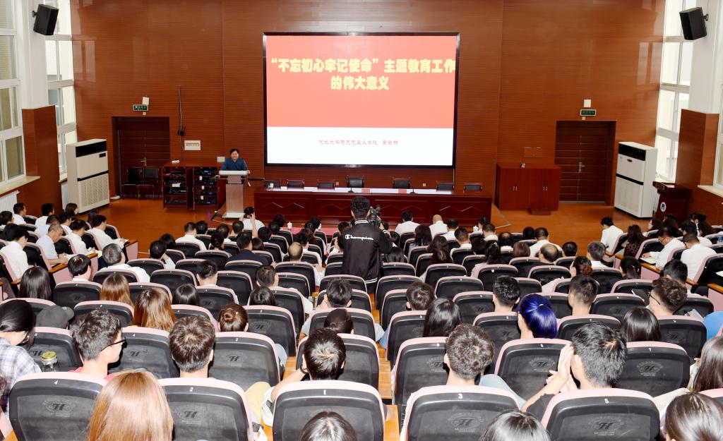 9月20日上午,我校在昌绪学术厅举办“不忘初心、牢记使命”主题教育首场专家辅导报告会,特邀河北大学马克思主义学院院长、博士生导师黄云明教授作了题为《“不忘初心、牢记使命”主题教育工作的伟大意义》的专题报告。校领导胡连利、回顺利、汤志江、徐景星、马丽娟、孙斌、赵其国,党委委员、纪委委员,各党总支、直属支部书记,主题教育领导小组办公室各组组长及学生代表共200余人聆听了报告。报告会由校党委副书记回顺利主持。
