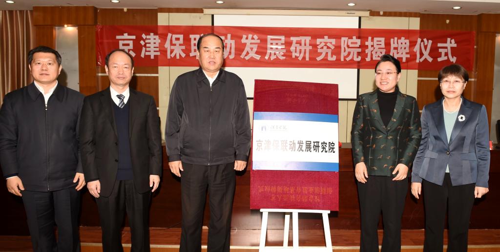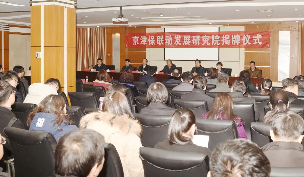 1月4日上午,京津保联动发展研究院揭牌仪式在我校教工之家举行。保定市人大常委会主任马誉峰、保定市政府副市长杨伟坤,我校党委书记胡连利,党委副书记、校长韩会玲,保定市文化广电和旅游局局长赵军、保定市委宣传部部务会成员解力平出席会议。市政府办公厅、市委宣传部、市委研究室、市人大研究室、市政府研究室、市发展和改革委员会、市文化广电和旅游局、市科技局、市工业和信息化局、市统计局、市教育局、市商务局、市金融办公室、市科学技术协会等14个市直部门的负责同志,华北电力大学、河北大学、河北农业大学、河北金融学院、保定职业技术学院等驻保高校的专家学者以及我校各二级学院院长、相关部门工作人员参加会议。会议由党委常委、副校长赵其国主持。