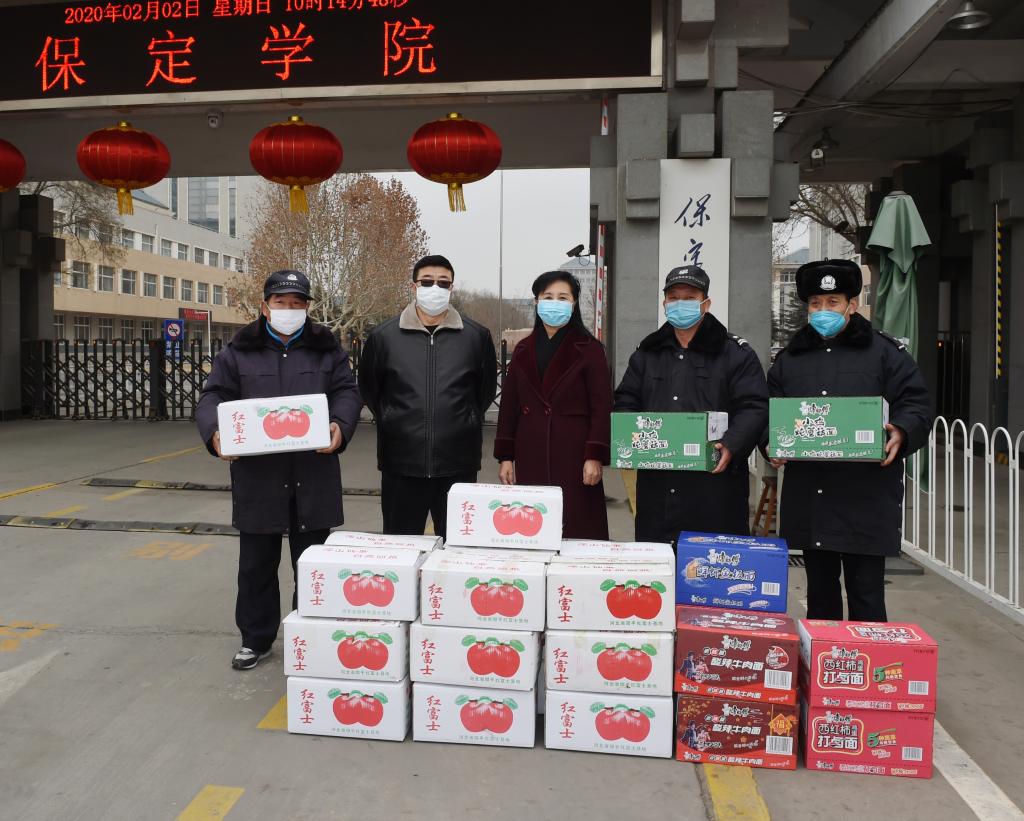 在全校上下全力投入疫情防控的关键时期,爱心企业保定市百胜餐饮企业管理有限公司总经理耿汝梅得知我校保卫人员和留校学生克服生活困难坚守岗位,非常感动,专门跑了多家超市采购了一批水果和方便食品。2月2日上午,她亲自送到学校保卫人员和留校学生手中,表达了对他们的关心和鼓励,也表达了同舟共济、战胜疫情的决心和信心。