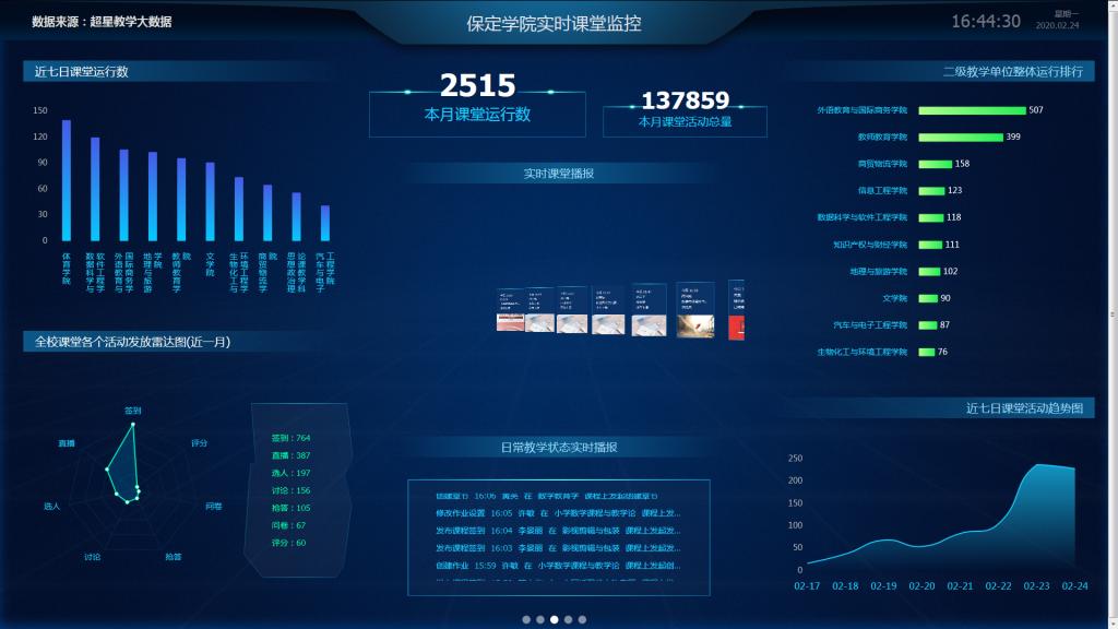 2月24日,我校在线教学正式开课,各学院教师按时展开线上授课,各个教学环节运行顺利。校党委副书记、校长韩会玲和党委副书记刘清波一大早便来到教务处会议室,通过数据大屏了解全校在线教学的开展情况,并连线到各个课堂进行随机听课,掌握在线教学的第一手资料。韩会玲对广大教师在线教学整体情况给予充分肯定,要求教务处协同教育教学质量监控中心、各二级学院做好学生延期返校期间在线教学的监管和服务,切实保证教学质量,并不断探索有效的措施和方法,推进我校线上、线下教学的创新与改革。