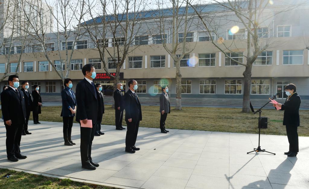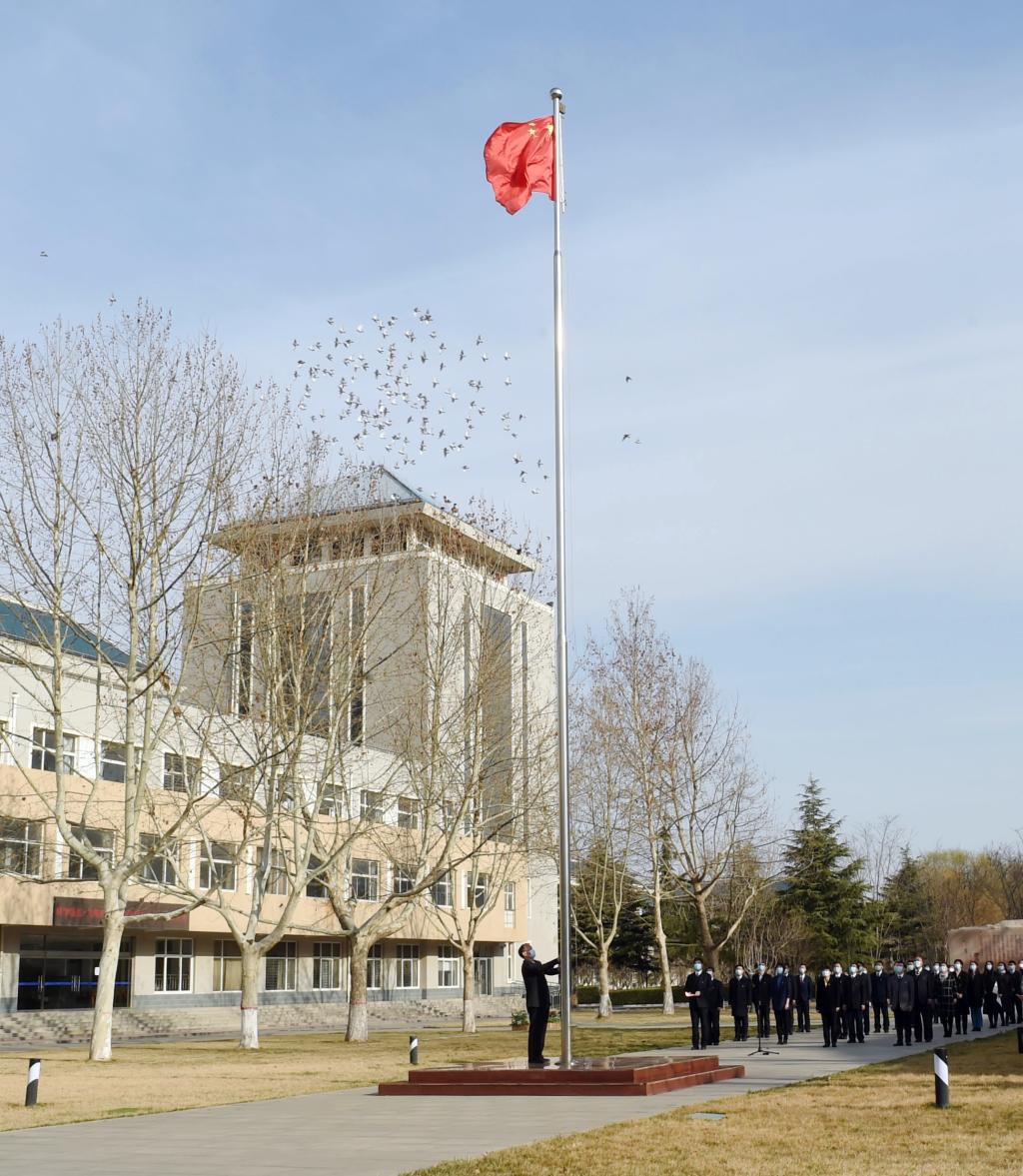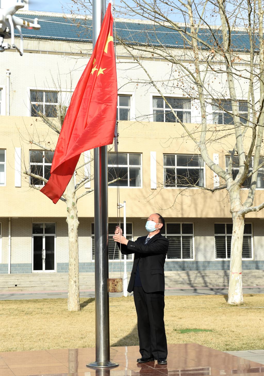 校领导韩会玲、刘清波、汤志江、徐景星、马丽娟、孙斌、赵其国和行政楼值班工作人员,身着正装,佩戴口罩,间隔1米,庄严肃立,向国旗行注目礼。