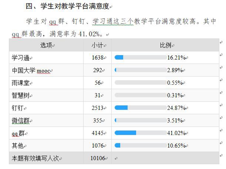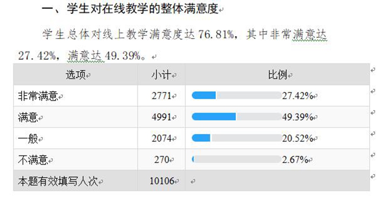 为及时了解线上教学运行状况,收集师生对教学的意见建议,利用问卷星编制了《保定学院在线教学学生学习状况和学习满意度问卷调查》和《保定学院线上教学情况问卷调查》,于线上教学第三周、第五周对学生和教师分别开展问卷调查。其中,学生学习状况和学习满意度问卷调查,共收回有效问卷10106份,涉及平台、课程、教师、满意度等15个方面;教师线上教学情况问卷调查,共收回有效问卷509份,占本学期线上教学开课教师总数的85.8%,涉及教师基本信息、平台、授课方式、教学方法等19个方面。对收集的调查数据及时汇总分析,形成《保定学院在线教学学生学习状况和学习满意度问卷调查报告》和《保定学院线上教学情况问卷调查报告》,将教学基本情况、学生学习情况、存在的问题及改进建议及时反馈给各二级学院、相关职能部门和教师,有针对性地进行整改。