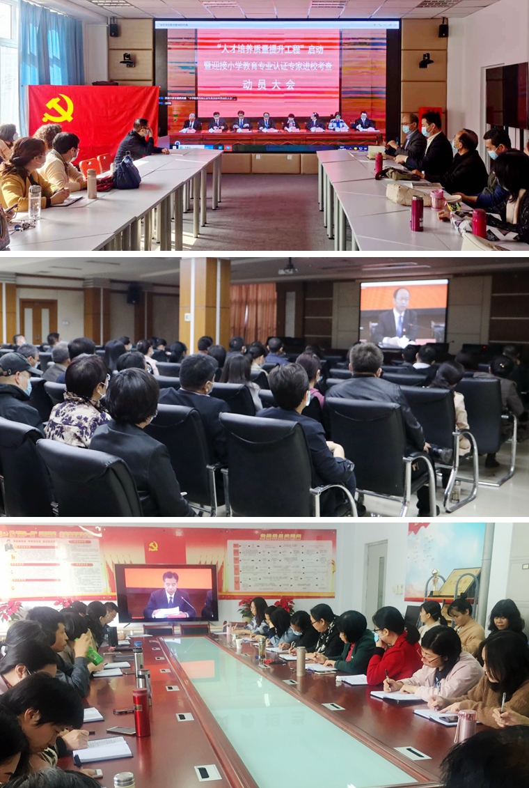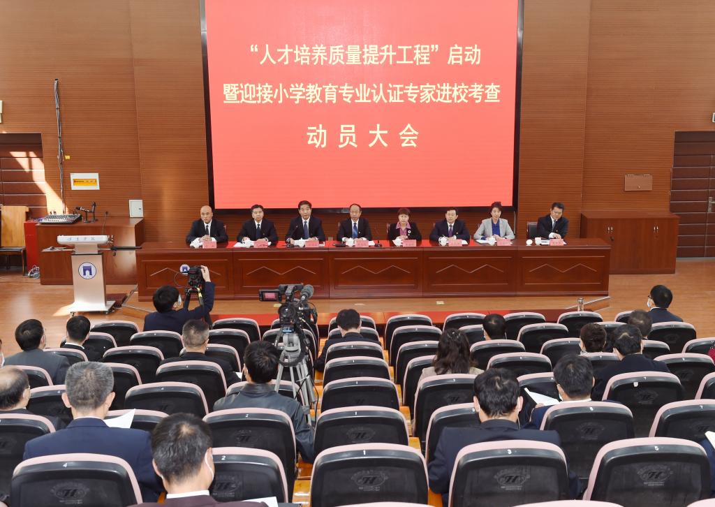 10月14日下午,我校召开“人才培养质量提升工程”启动暨迎接小学教育专业认证专家进校考查动员大会。校领导胡连利、韩会玲、刘清波、汤志江、徐景星、马丽娟、孙斌、赵其国,各职能部门、教辅单位中层干部,各二级学院院长、副院长、副书记,教务处、教育教学质量管理中心全体工作人员在昌绪学术厅主会场参加现场会议,各二级学院书记及其他教职工在各分会场参加线上会议。会议由党委副书记刘清波主持。