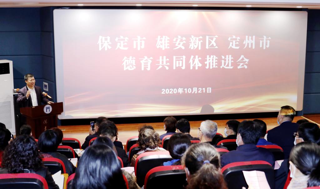 10月21日上午,保定市、雄安新区、定州市德育共同体推进会在我校凤凰展映厅举行。河北省教育厅德育研究中心主任蔡杭州,省德育研究中心干部李向阳,保定市教育局副调研员黄旭,我校党委常委、副校长马丽娟,河北大学、河北农业大学、中央司法警官学院、河北金融学院、冀中职业学院和我校学生处、马克思主义学院负责同志,保定市教育局相关部门负责同志以及来自保定市、雄安新区、定州市的中小学、幼儿园负责同志,共50余人参加会议。会议由黄旭主持。