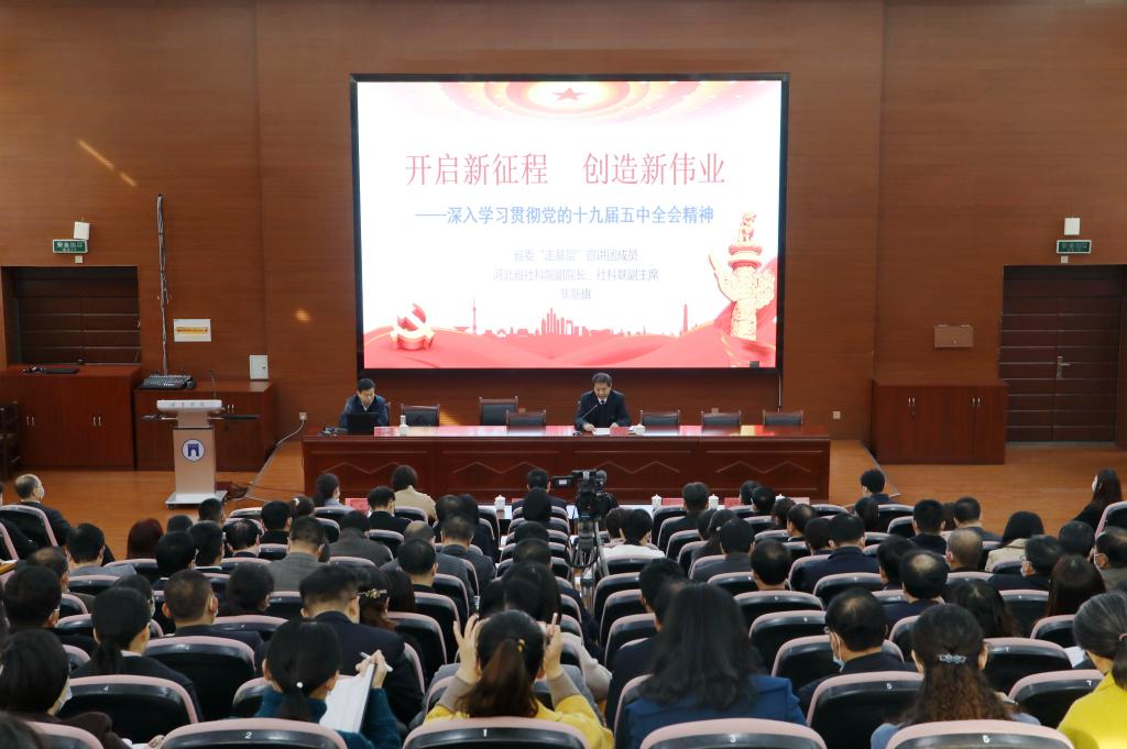11月24日下午,河北省委“走基层”宣讲团成员、河北省社科院副院长、社科联副主席焦新旗来到我校,以《开启新征程创造新伟业——深入学习贯彻党的十九届五中全会精神》为题,宣讲党的十九届五中全会精神。