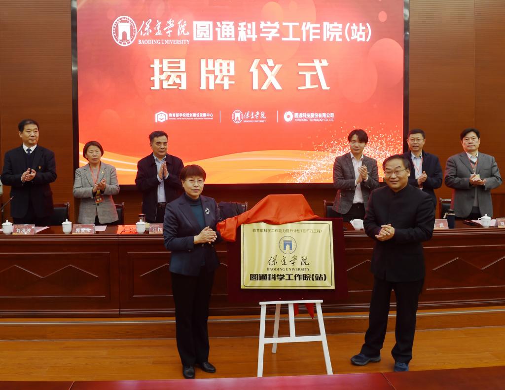 王民权、韩会玲共同为“保定学院圆通科学工作院(站)”揭牌。