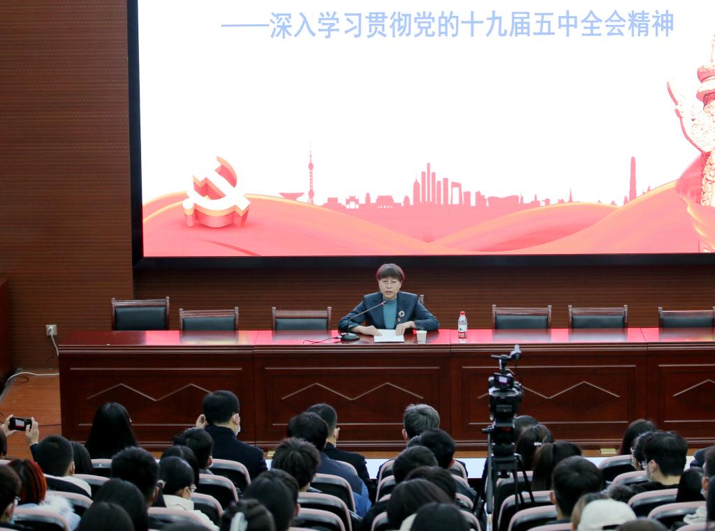 校领导刘清波、汤志江、徐景星、马丽娟、孙斌、赵其国也深入所联系部门、学院宣讲全会精神。他们围绕“开启新征程 创造新伟业”主题,与师生们共同回顾党和国家事业取得的辉煌成就,共同展望“十四五”时期和2035年远景发展的美好蓝图,强调广大师生要认真学习贯彻全会精神,用全会精神统一思想,凝聚力量,将全会精神转化为教书育人、研学奋斗的坚定行动,为加快建设符合时代要求、受人尊重、特色鲜明的应用型大学作出新的更大贡献。