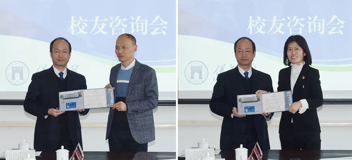 会上,胡连利一一为校友们颁发了校友卡和感谢状,并合影留念。
