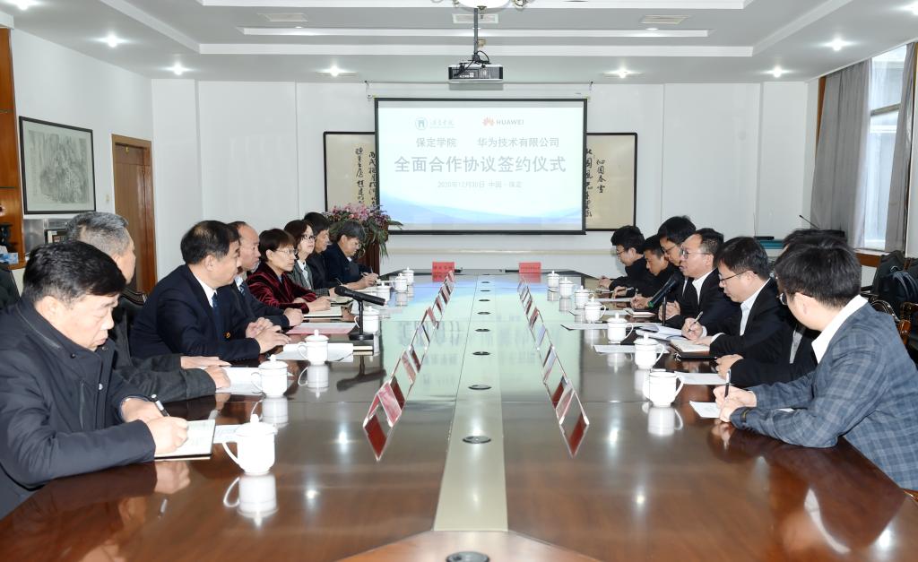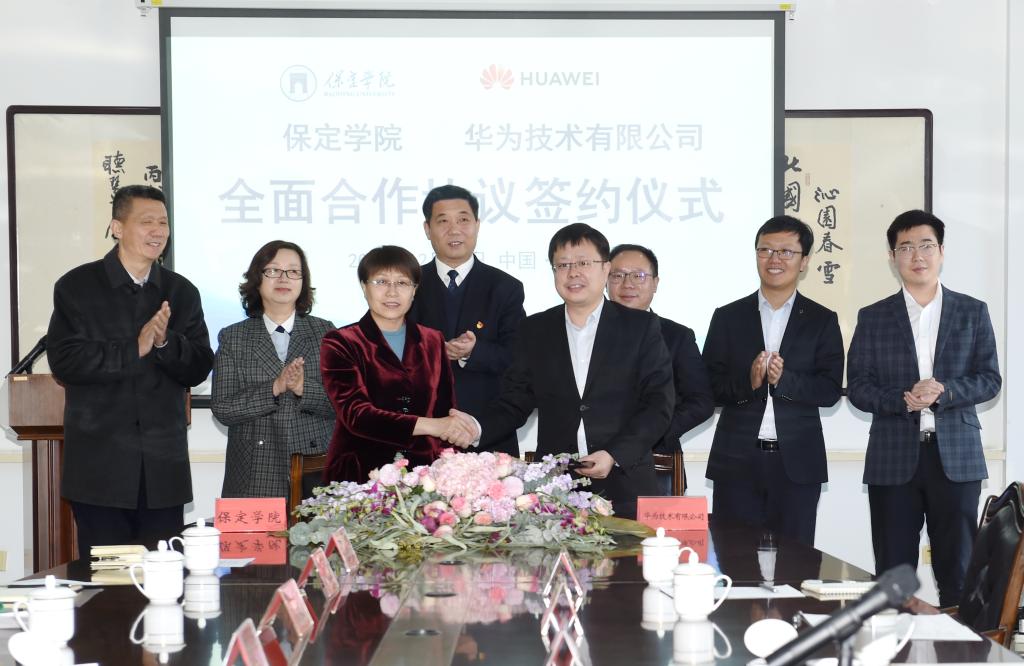 12月30日上午,我校与华为技术有限公司《全面合作协议》签约仪式在行政楼第二会议室举行。华为技术有限公司中国政企教育高校系统部部长游奎武、河北政企教育业务部总经理魏华、保定政企业务部总经理张涛、保定政企业务部副总经理程军华、河北政企教育业务部技术总监王亮、保定政企业务部教育行业经理王义博、保定政企业务部技术总监赵硕,我校党委书记胡连利,党委副书记、校长韩会玲,党委副书记刘清波,相关部门、学院负责同志参加签约仪式。仪式由刘清波主持。