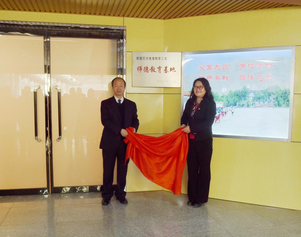 李冬玲、胡连利共同为“新疆巴州党委教育工委师德教育基地”揭牌。