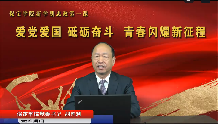 胡连利以《爱党爱国 砥砺奋斗 青春闪耀新征程》为题,从深入学习百年党史,明确时代使命;弘扬伟大抗疫精神,彰显中国力量;坚守爱党爱国信仰,永葆青春底色;自觉传承三个基因,勇担复兴大任等四个方面带领学生们全面回顾党的百年光辉历程,深刻领会脱贫攻坚全面胜利的重要意义,深入理解伟大抗疫精神的内涵、价值,学习新时代卫国戍边英雄官兵誓死捍卫国土的爱国精神。胡连利鼓励学生们传承弘扬保定学院的红色基因、科学基因、文化基因,让青春最亮丽的底色——爱党爱国在新时代民族复兴的奋斗征程上焕发出别样的光彩。