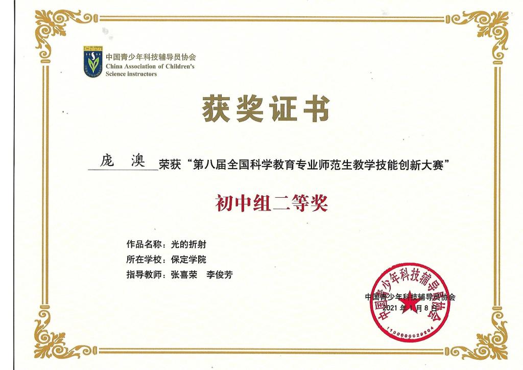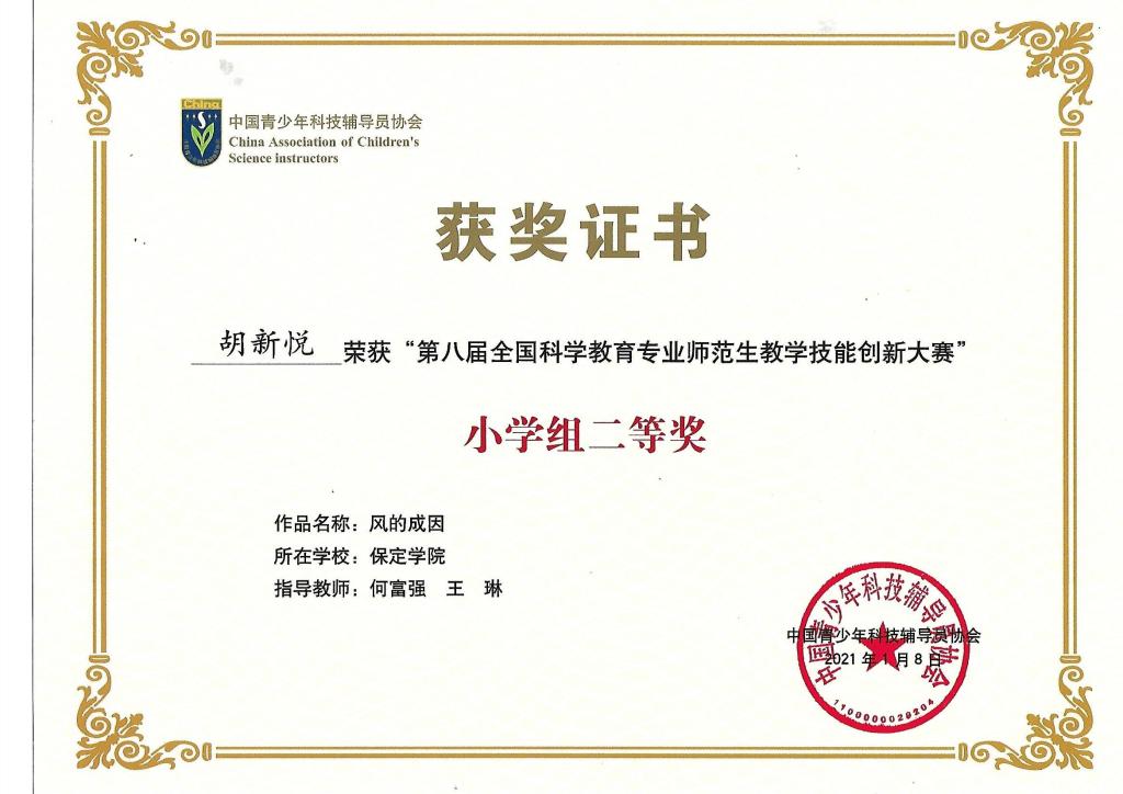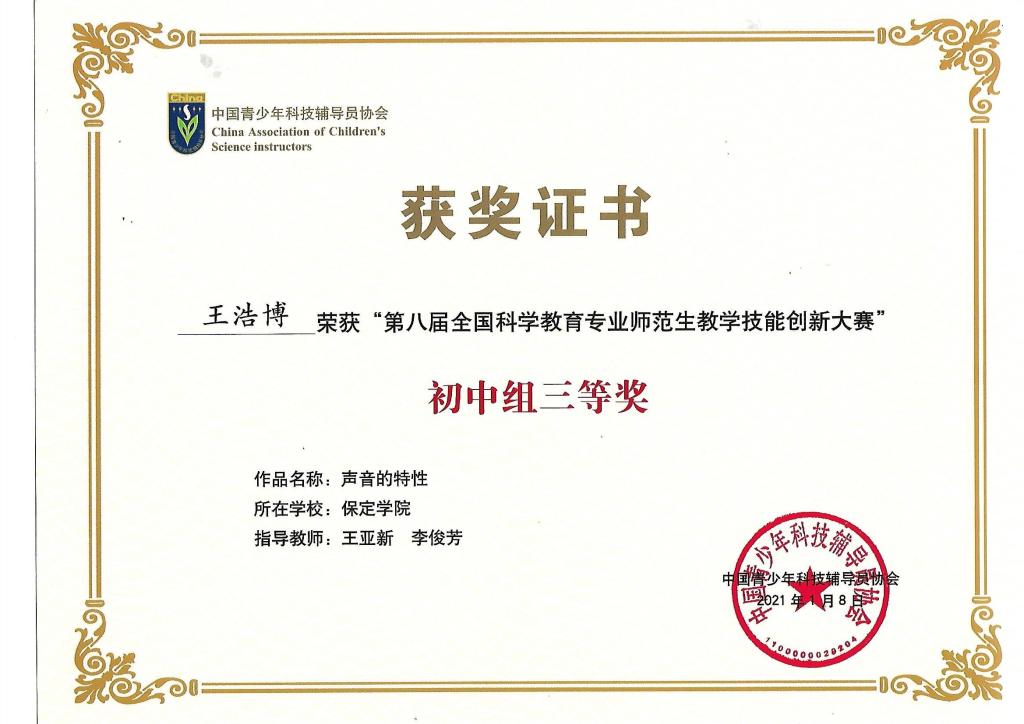 近日,我校收到第八届全国科学教育专业师范生教学技能创新大赛组委会寄来的获奖证书,汽车与电子工程学院学生庞澳、朱雅琪,生物化工与环境工程学院学生胡新悦荣获大赛二等奖,汽车与电子工程学院学生王浩博荣获大赛三等奖。
