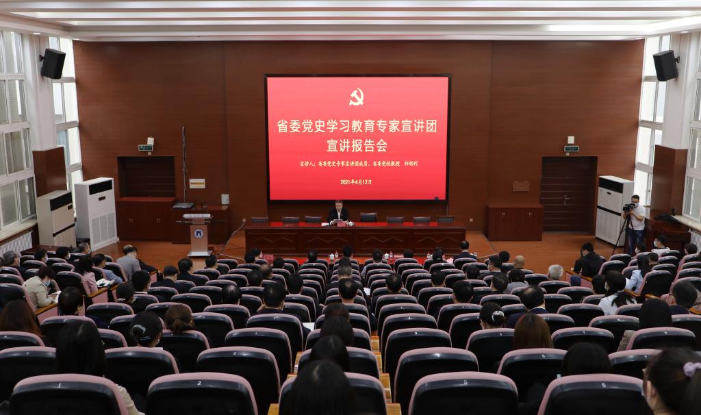 4月12日下午,省委党史学习教育专家宣讲团成员、省委党校教授祁刚利,联络员吴乾一行来我校举行宣讲报告会。市委常委、宣传部部长、市委党史学习教育领导小组副组长杨宝东,市委党史学习教育领导小组办公室常务副主任解力平,市委宣传部、市委组织部、市直工委、市委教育工委、市委党史研究室、市委党校、市国资委的负责同志,以及我校领导胡连利、韩会玲、汤志江、徐景星、孙斌、赵其国和师生代表聆听了宣讲。报告会由校党委宣讲团团长、党委书记胡连利主持。