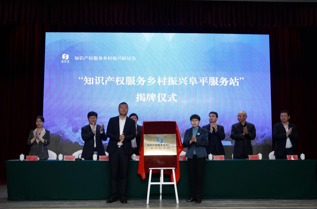 韩会玲和杨进忠共同为“知识产权服务乡村振兴阜平服务站”揭牌。