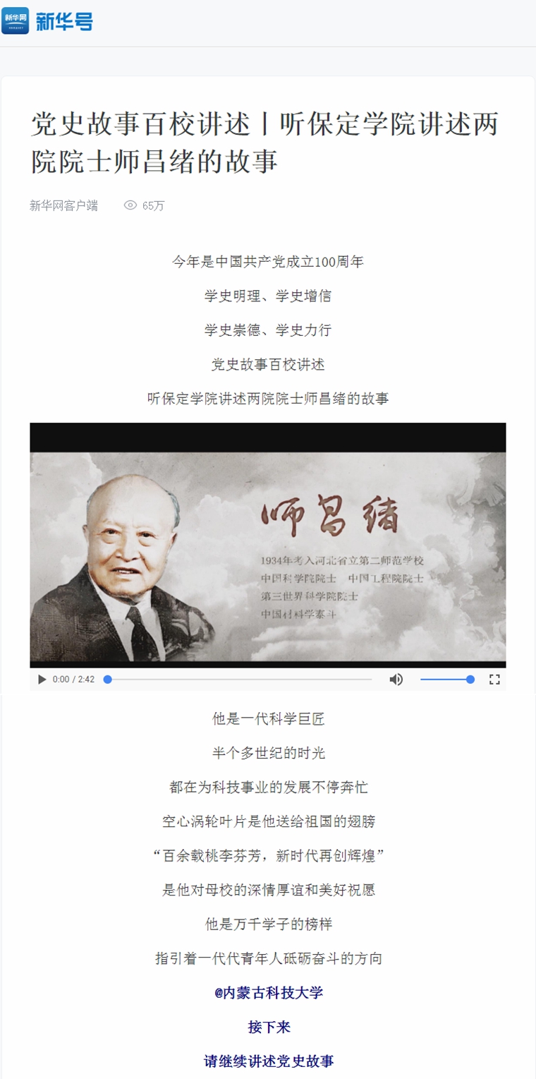 4月26日,我校拍摄制作的党史故事视频《“红二师”走出的两院院士》在新华网客户端播出。视频讲述了我校杰出校友师昌绪先生献身科学、矢志报国的先进事迹,深情展现了师昌绪先生对母校和青年学生的关怀。视频播出后引起热烈反响,上线仅几小时,阅读量就突破了65万次,引发了全校师生的情感共鸣,受到了社会各方的高度关注。